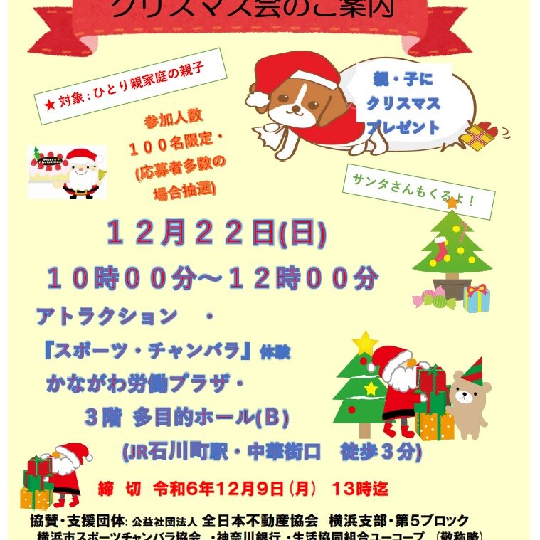 ひとり親家庭の子どもたちへの応援 クリスマス会 12月22日(日) 10時~12時 かながわ労働プラザ・3階多目的ホール(B)(JR石川町駅・中華街口徒歩3分) 対象:ひとり親家庭の親子100名(応募多数の場合は抽選) …